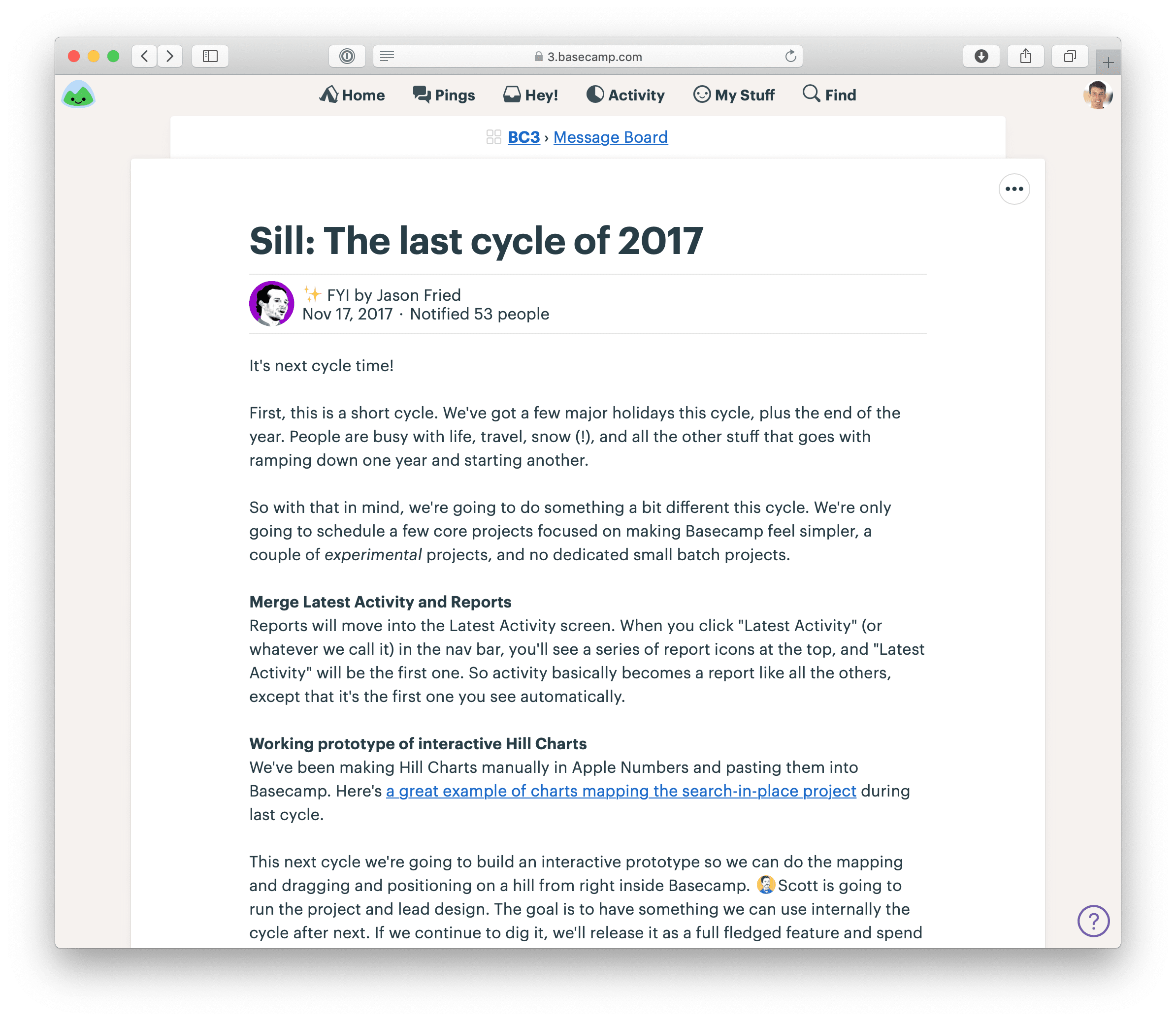To be precise, there was some overlap between R&D and production mode after that first year. Basecamp was big enough as a company that the senior team could shape and delegate production-mode projects around parts of the app that were settled while continuing to explore new territory in R&D mode themselves.