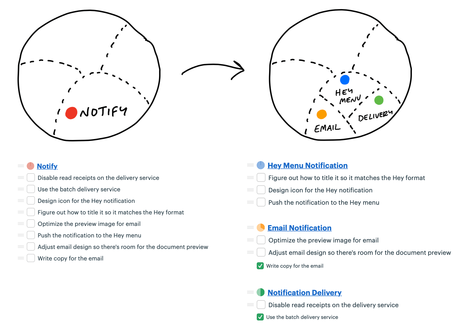 When we checked in with the team, it turned out the work was moving along just fine. The problem was that “Notify” wasn’t a single thing. It had three different parts: designing an email, delivering the email in the back-end, and displaying the notification in an in-app menu. The team mostly finished the code for delivering the email. The design of the email was nearly figured out. But they hadn’t started on the in-app display. It wasn’t possible to say whether “Notify” as a whole was over the hill or not because parts of it were and parts of it weren’t.