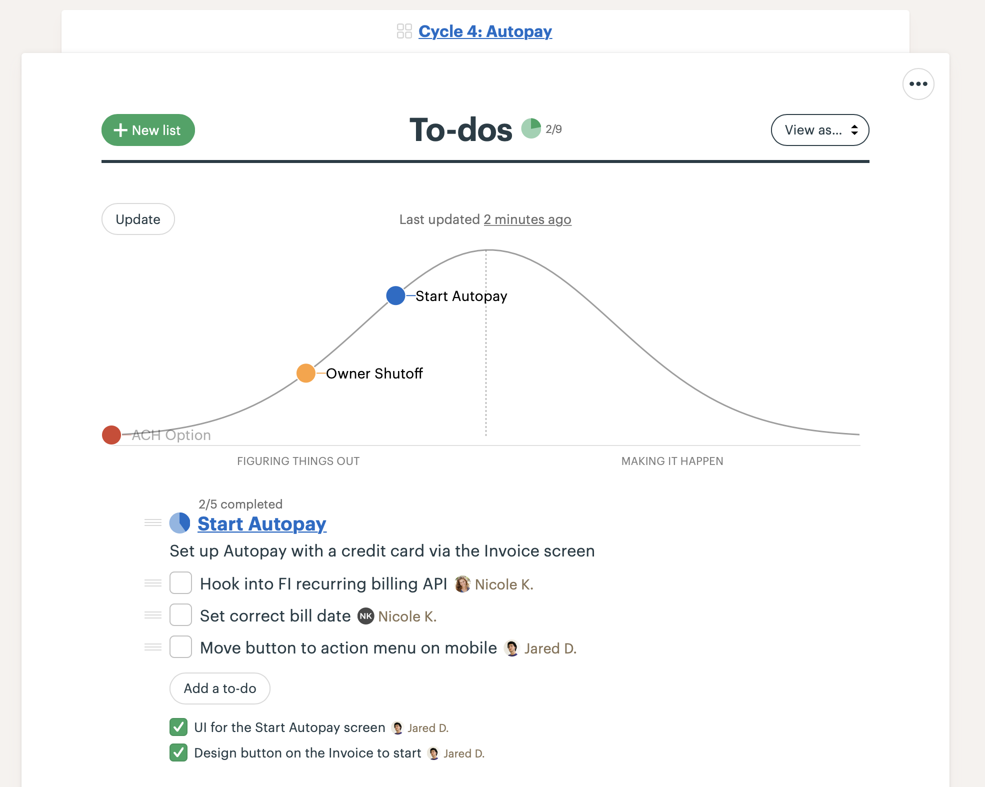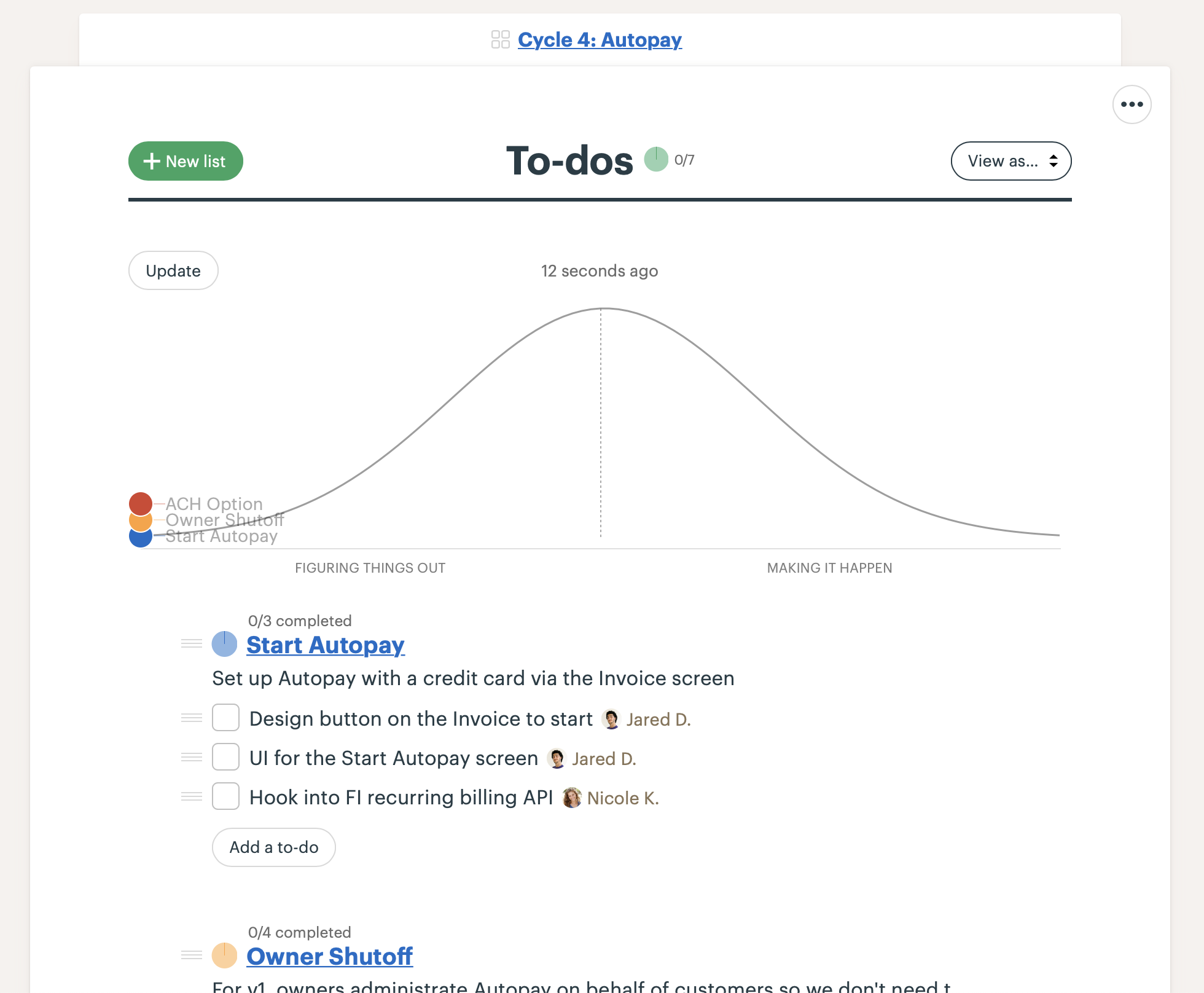 - Navigate to the To-Do List page for each scope and click the options menu (•••) in the upper right. Click “Track this on the Hill Chart.” That will display a Hill Chart at the top of the overall To-Dos section of the Project, with a dot corresponding to that scope (To-Do List).