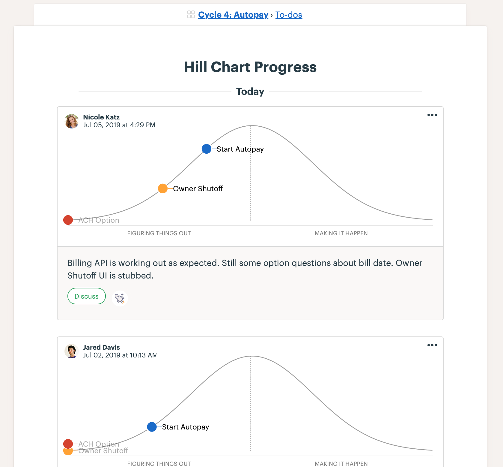 - To see the history of updates to the Hill Chart, click the timestamp above the Hill Chart where it says “last update.”