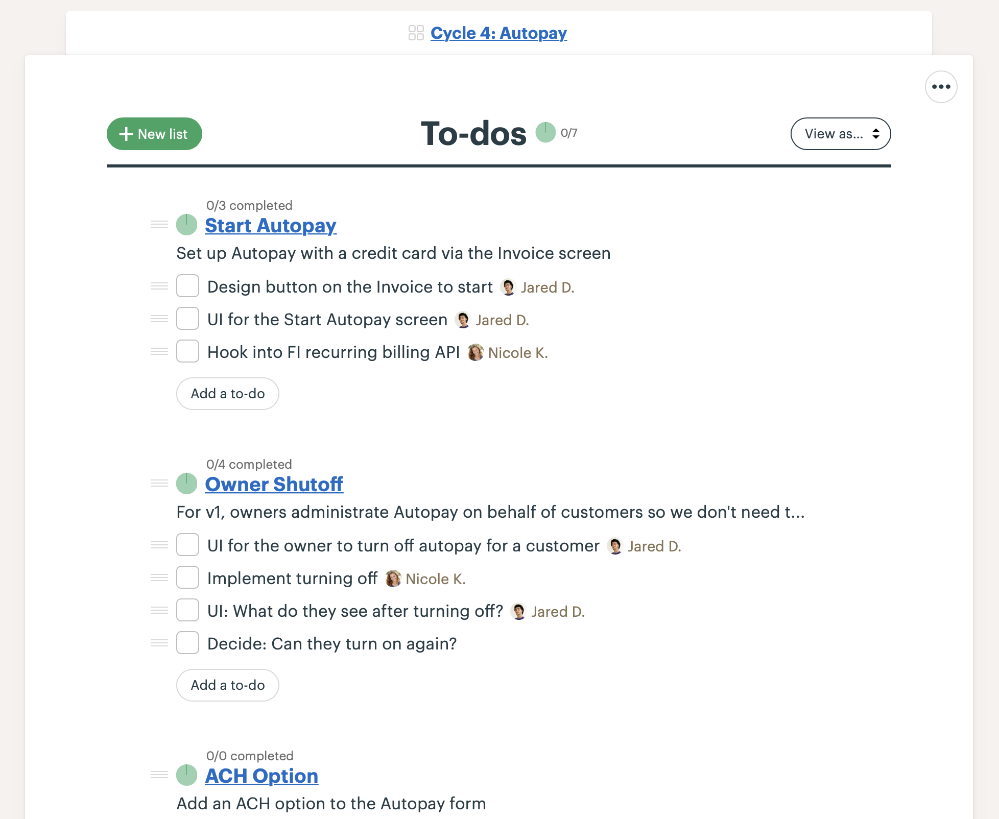 - Create a Basecamp Project for each project in the six-week cycle. We usually prepend a name or number for the cycle like this: “Cycle 4: Autopay.”